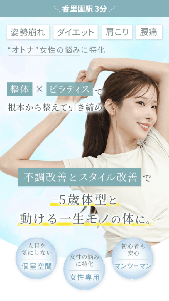 香里園駅から徒歩わずか3分、ピラティストトヤセ香里園店は、あなたの健康と美をサポートする完全個室のマンツーマンの寄り添い型スタジオです。